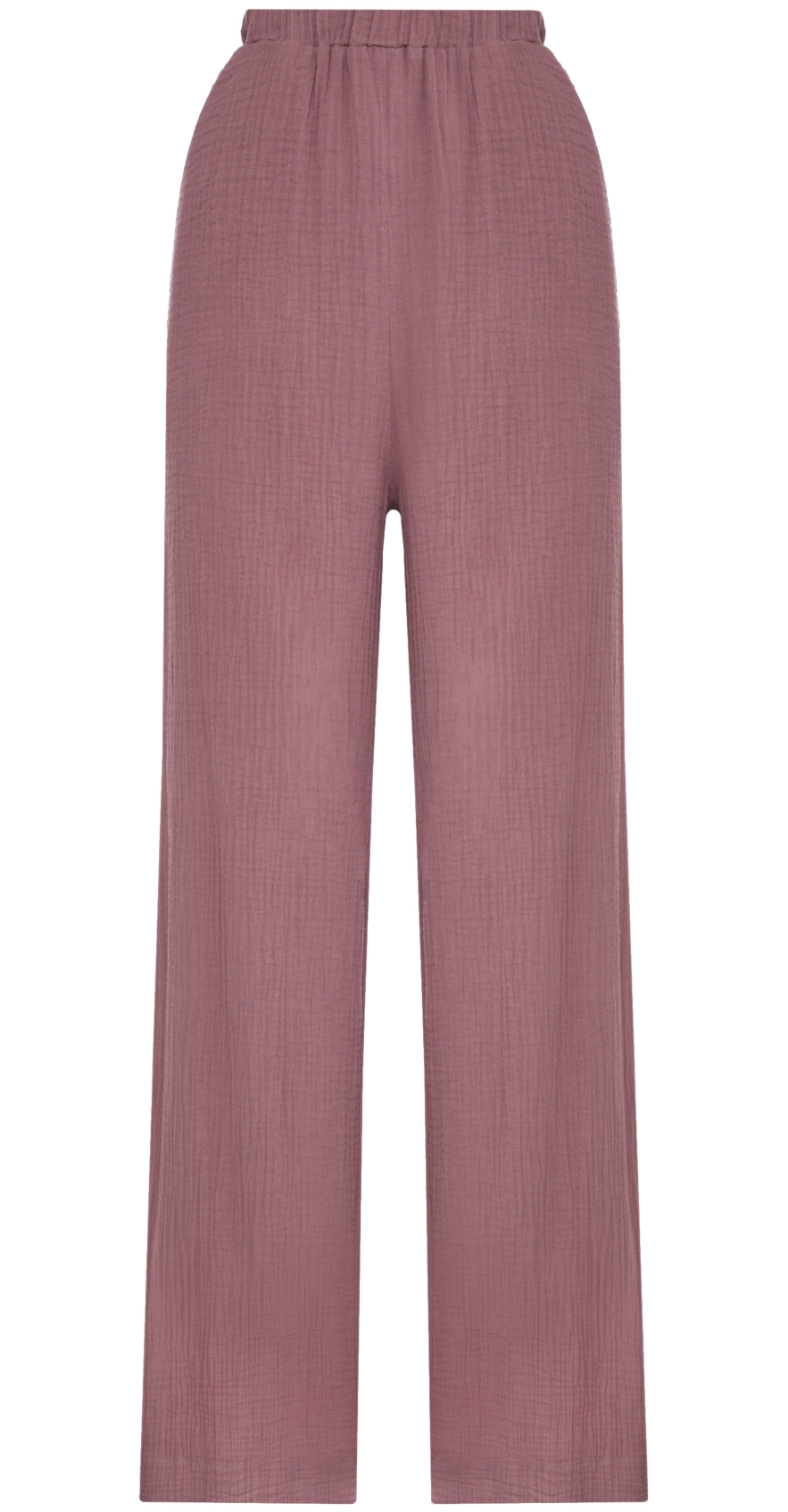 Mauve double gauze cotton high-waisted and relaxed fit wide-leg pants with side pockets. Enjoy your Japanese inspired home look and the feel of the soft fabric.