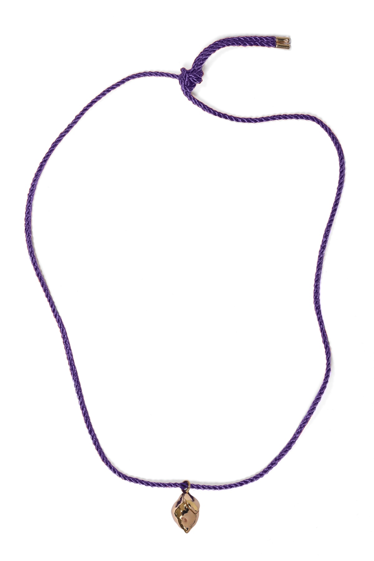 Purple silk cord adjustable necklace with 18k gold plated lemon shaped pendant and tie knot fastening.
