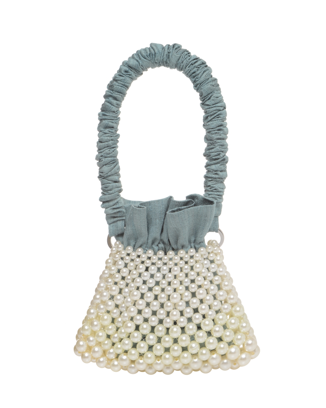 Handmade pearl embellished baguette with removable silk pouch and twisted handle.