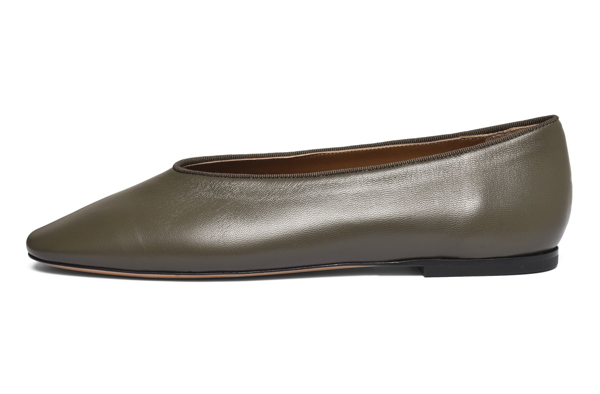 Taking cues from Italy’s rich history, these olive hued flats are inspired with 19th century footwear styles. Crafted from soft leather, they feature square toe silhouette with grosgrain complemented low cut vamp, barely-there sole and cushioned insole, which provides comfortable wearing experience.