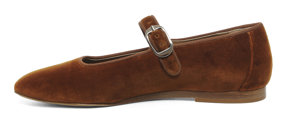 Handmade in Italy by local artisans, Le Monde Beryl’s amber Mary Jane flats demonstrate label’s exquisite craftsmanship. Made with a plush velvet upper, they are set on thin sole and feature square toe profile along the grosgrain detailed low cut vamp, which is defined with buckle fastened strap.