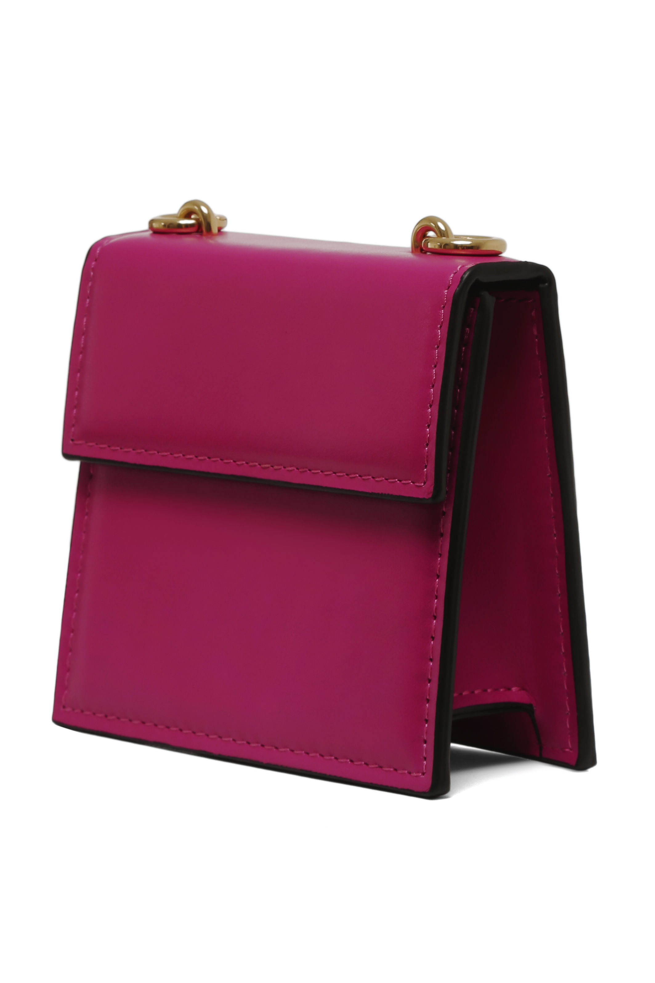 Square shape flap purse in fuchsia supple leather with emovable strap and gold hardware.