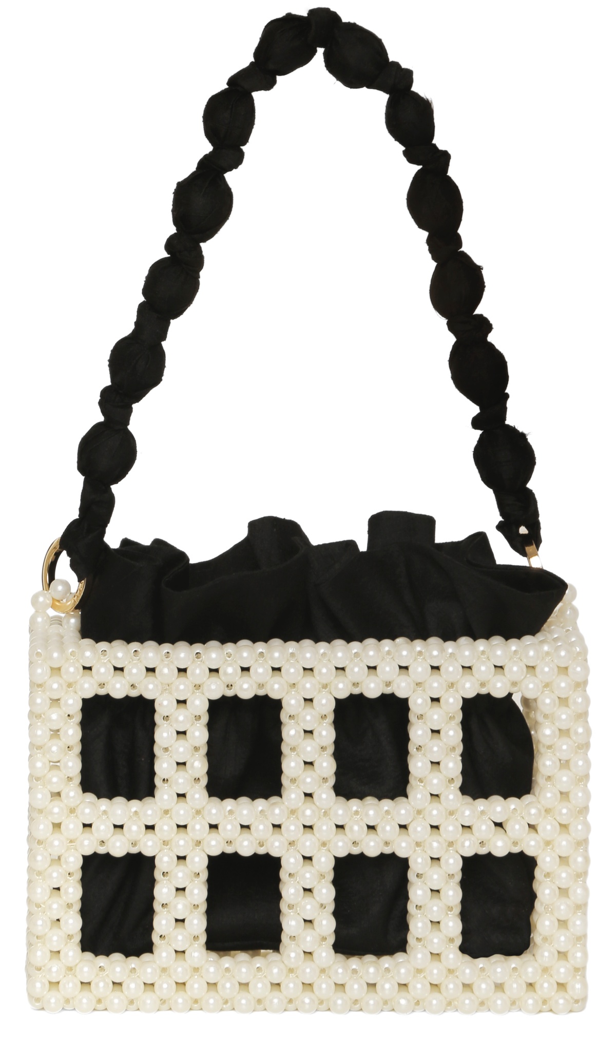 Handmade pearl embellished rectangle shaped bucket bag with removable pouch.