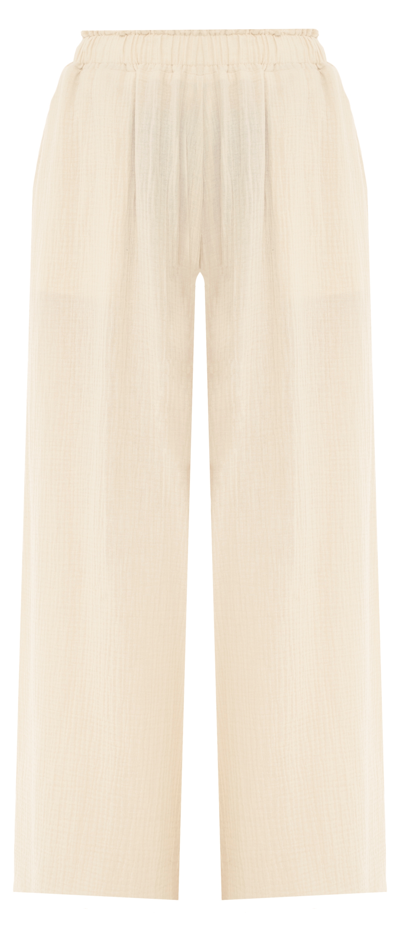 Porcelain wide leg pants which feature elasticated waist along the side slit pockets.
