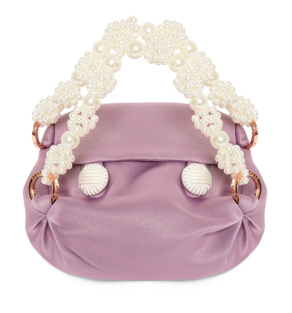 Silk-satin tiny tote with two button fastening and pearl beaded handles.