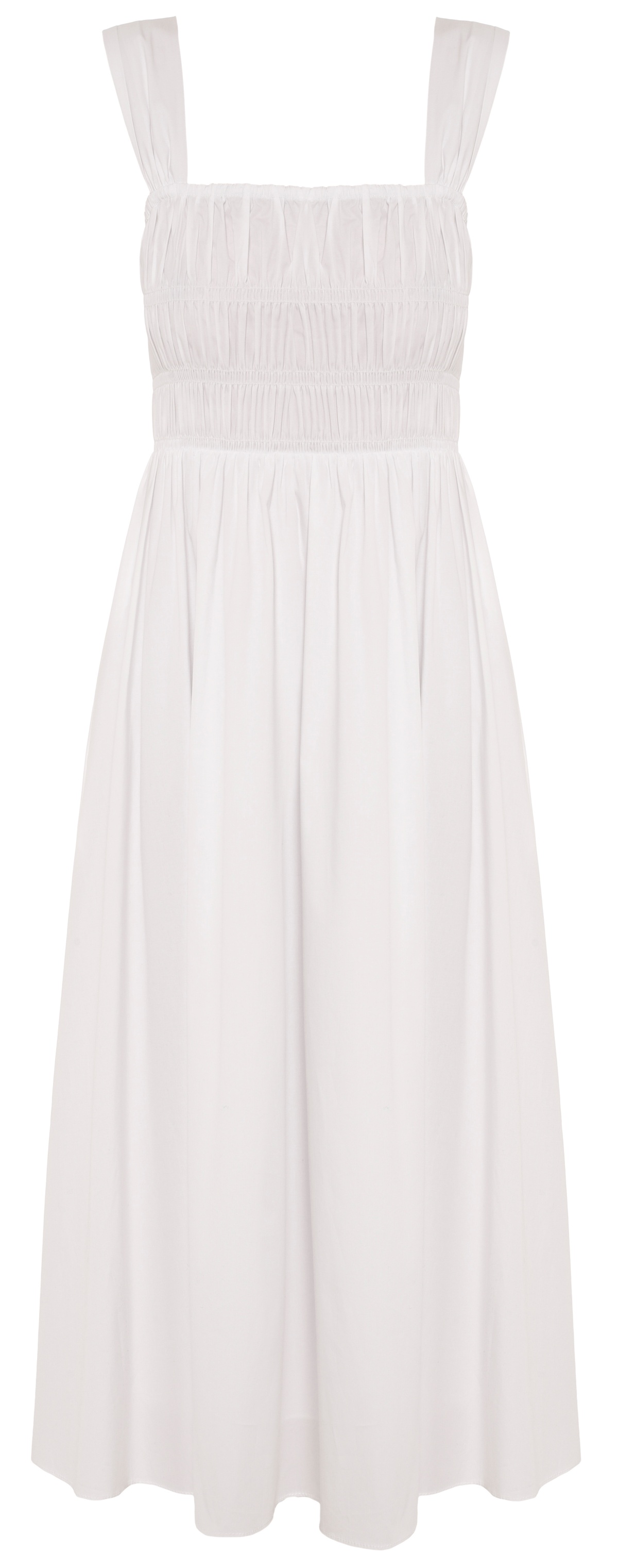 The best option for summer, White Ida Dress from Staud is crafted from lightweight cotton poplin with added stretch for comfort and a relaxed finish that is perfect for sun-soaked months. The piece features a square neckline and back zip closure along with the smocked bust which is elasticated to enhance a pleasant wearing experience.