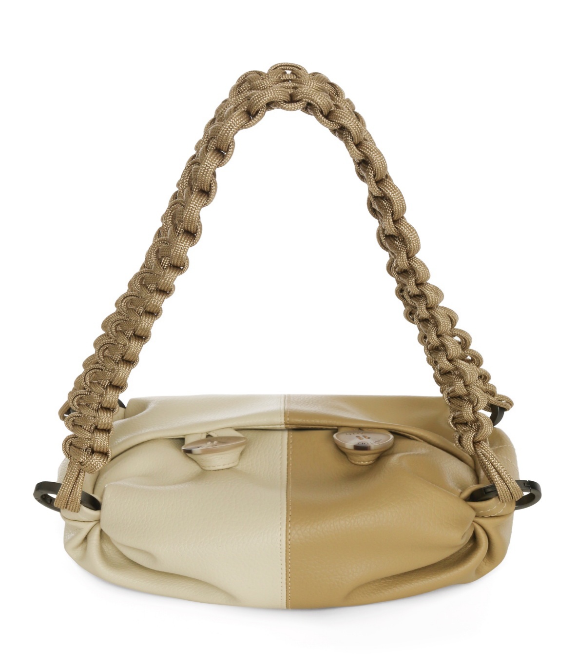 Tiny Nino Tote is crafted with two colliding vegan leather panels which create coloblocking effect in order to nod to Mark Rothko’s work. Complementing casual as well as evening outfits, the bag is accentuated with matte gunmetal hardware and features button closure alongside handwoven paracord handles.