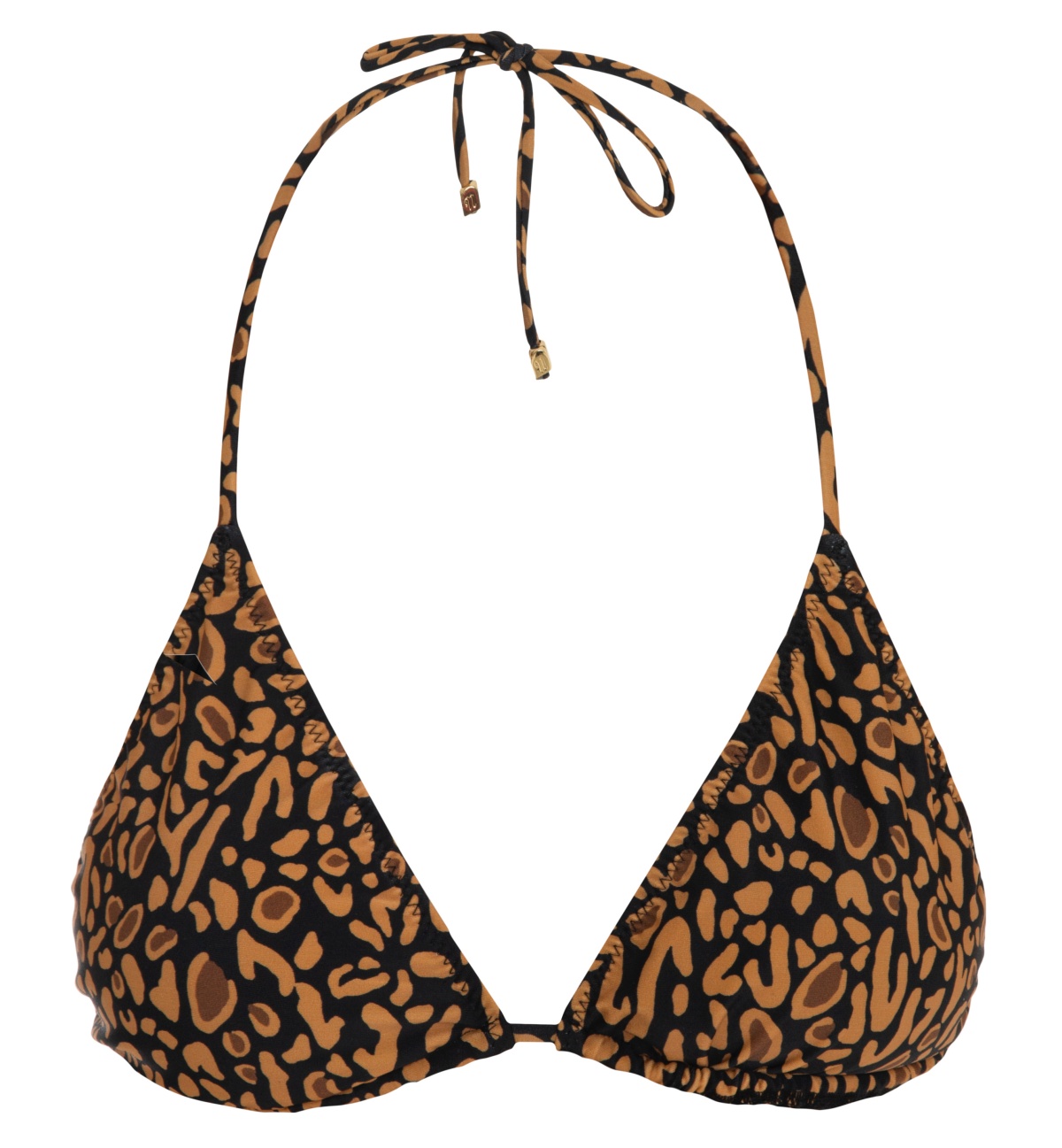 Leopard Caia Bikini Top from Nanushka puts a sustainable spin on traditional swimsuit silhouette. Cut from recycled matte fabric, the piece features classic triangle profile and fastens with ties.