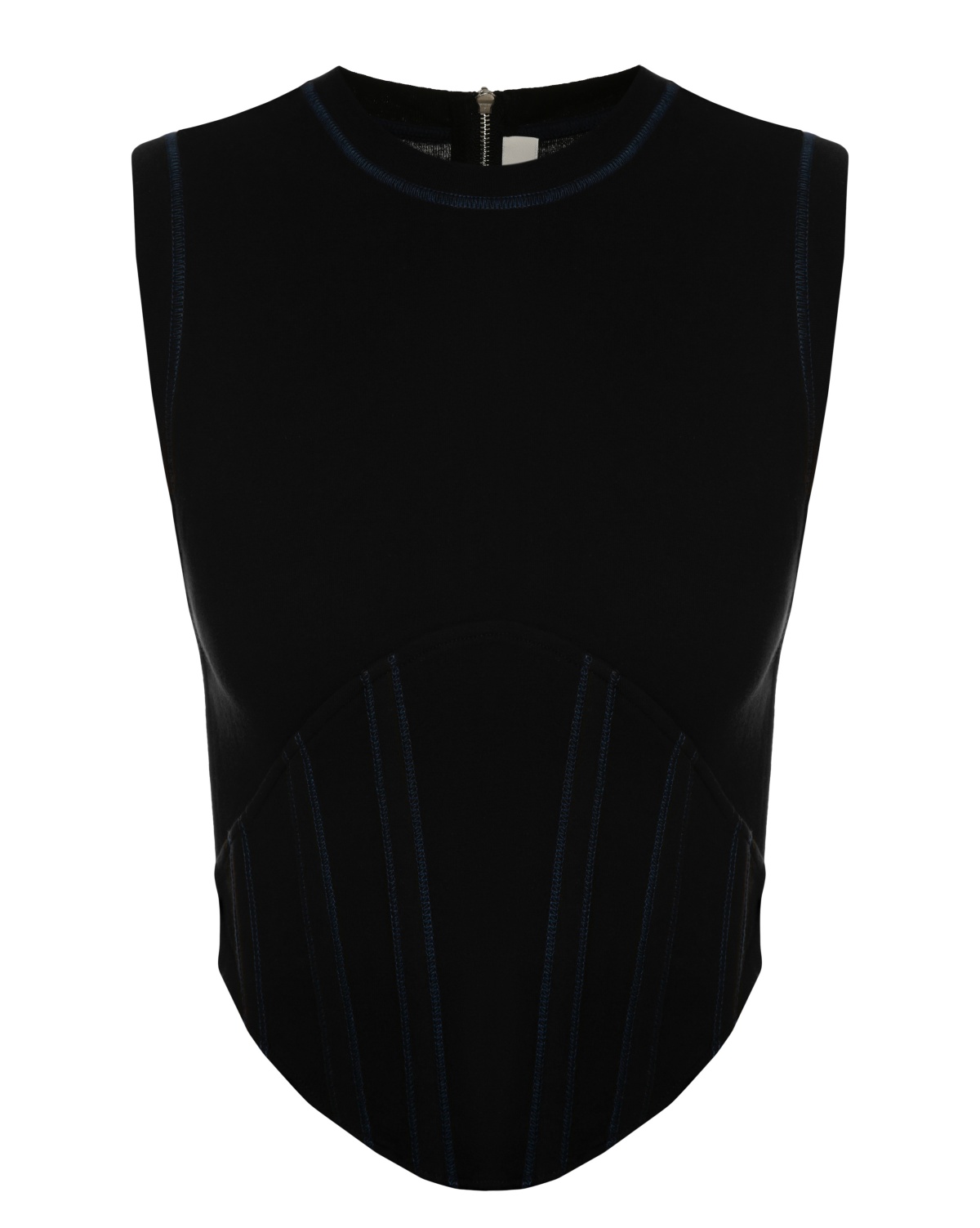Subverting a classic muscle tank with an inverted undercorset panel, Dion Lee offers a Black Top that is deceptively practical with a dose of ingeniosity. Crafted from sumptuous rib knit cotton, the piece is constructed for a close fit and features scoop neckline along with a slightly cropped hem. The design is highlighted with contrasting overstitching and fastens with a signature metal zip closure.