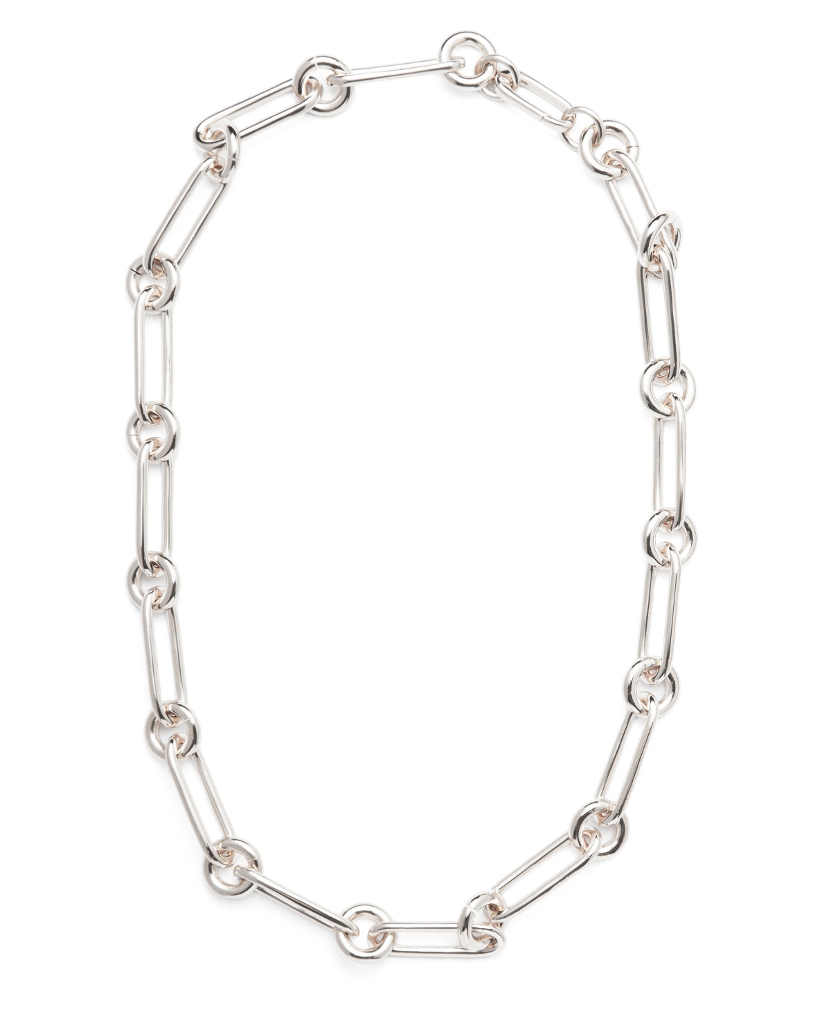 Transitioning admiration of New York’s industrial landscapes from designer to wearer, Ilaria Necklace can lend a dose of contemporary glamour to any outfit. Crafted from silver-plated brass, the item is defined with an elongated interlock chain silhouette and features lobster claw fastening.