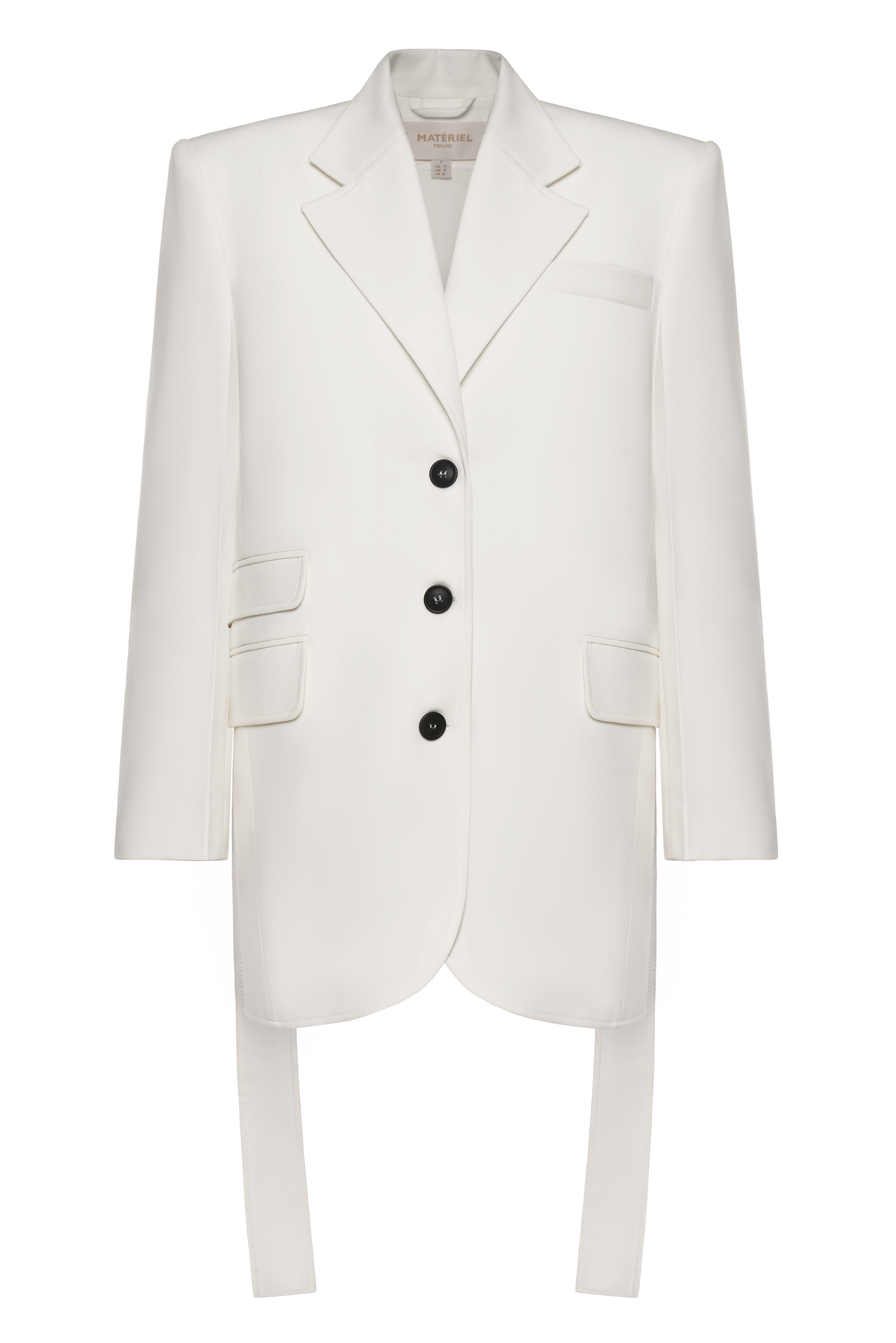 Decided in a pristine white hue to symbolize hope and clarity - Materiel's main inspiration for the resort collection, Oversized Blazer adheres to the traditional menswear tailoring codes and is cut to have a boxy silhouette. It features single-breasted fastening along with the welt pockets, notch lapels a removable belt that cinches the waist to soften the profile with a feminine touch.