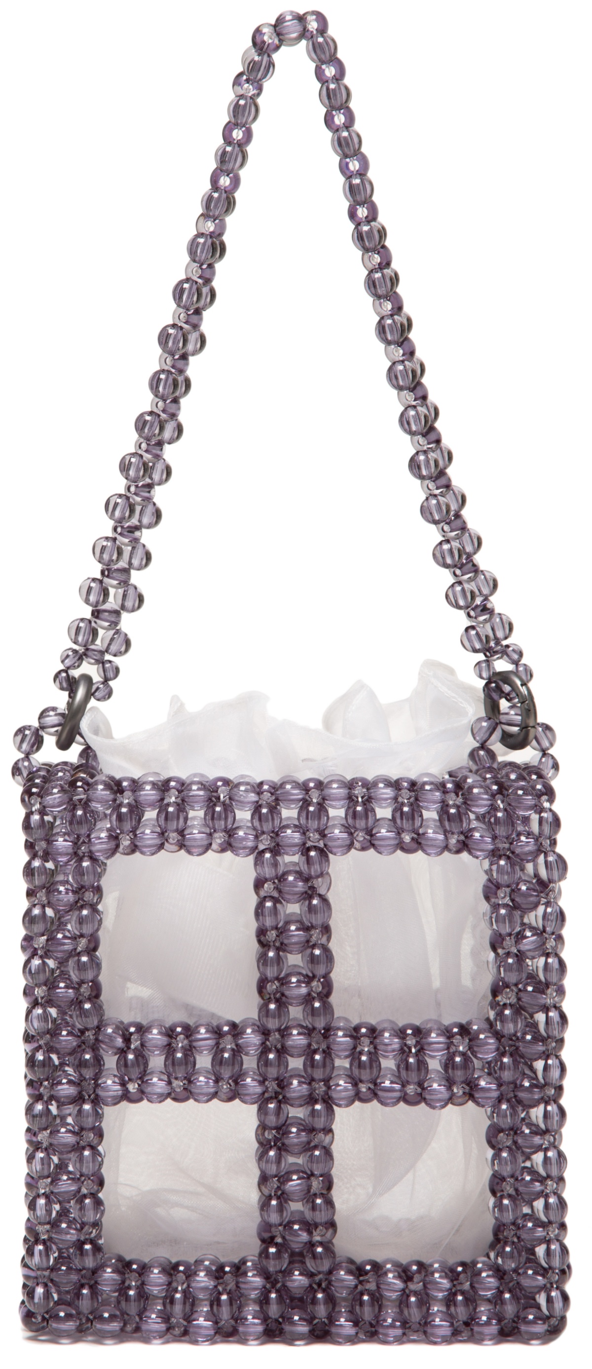 0711 Tbilisi's Midnight Blue Tekla Bucket Bag finds a congenial middle ground between contrasting elements - structured handmade silhouette of it is softened by airy organza pouch. The bag is defined with minimalistic square profile that is elevated with a dose of playfulness due to shimmer of opaque beads.