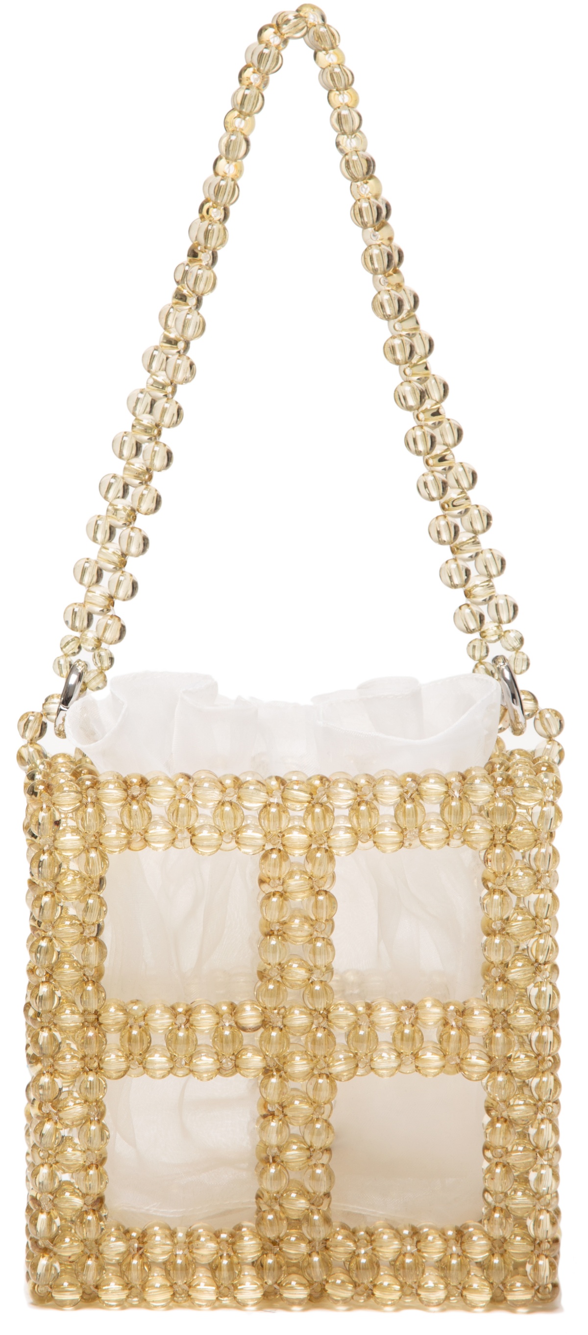 0711 Tbilisi's Midnight Blue Tekla Bucket Bag finds a congenial middle ground between contrasting elements - structured handmade silhouette of it is softened by airy organza pouch. The bag is defined with minimalistic square profile that is elevated with a dose of playfulness due to shimmer of opaque beads.