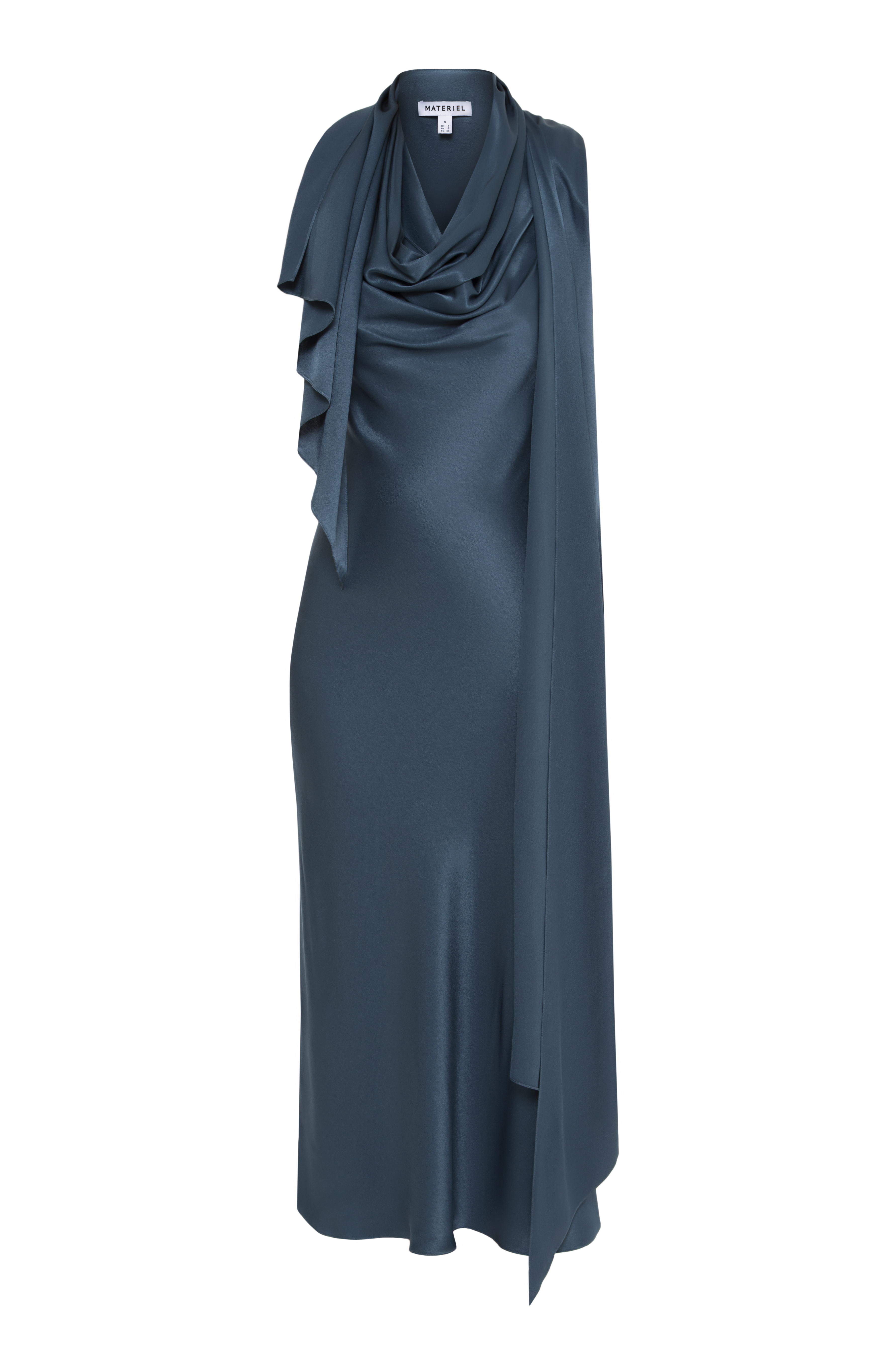Materiel's aesthetic is mainly centered on sharply tailored separates, which come offset by feminine profiles in a lineup of environmentally conscious sensual pieces. Above mentioned is perfectly highlighted bყ Teal Midi Dress. Crafted from fluid satin into a slimline profile, the piece fastens with a side zip closure and its unfussy design is elevated with a distinct scarf-detailed neckline.