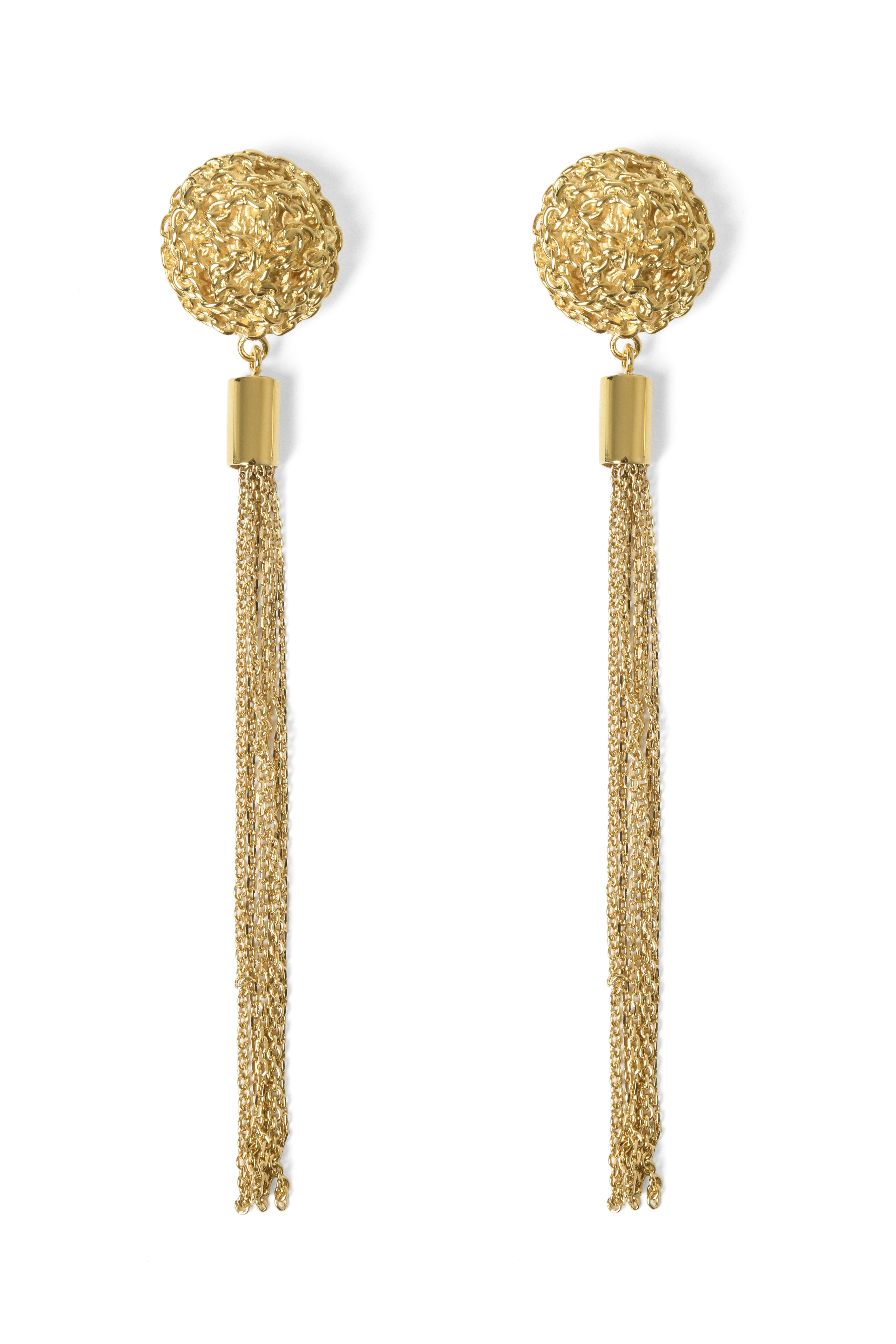 Resulting in exquisite jewelry selection, Materiel extends its newfound interest in creating accessories. One of the noteworthy offerings is Gold Chain Earrings, utilising charming statement finishes that put a fresh twist on the label's laid-back aesthetic. Crafted in Italy from recycled brass, the piece features an intertwined, intricate profile that is punctuated with slinky chain fringes.