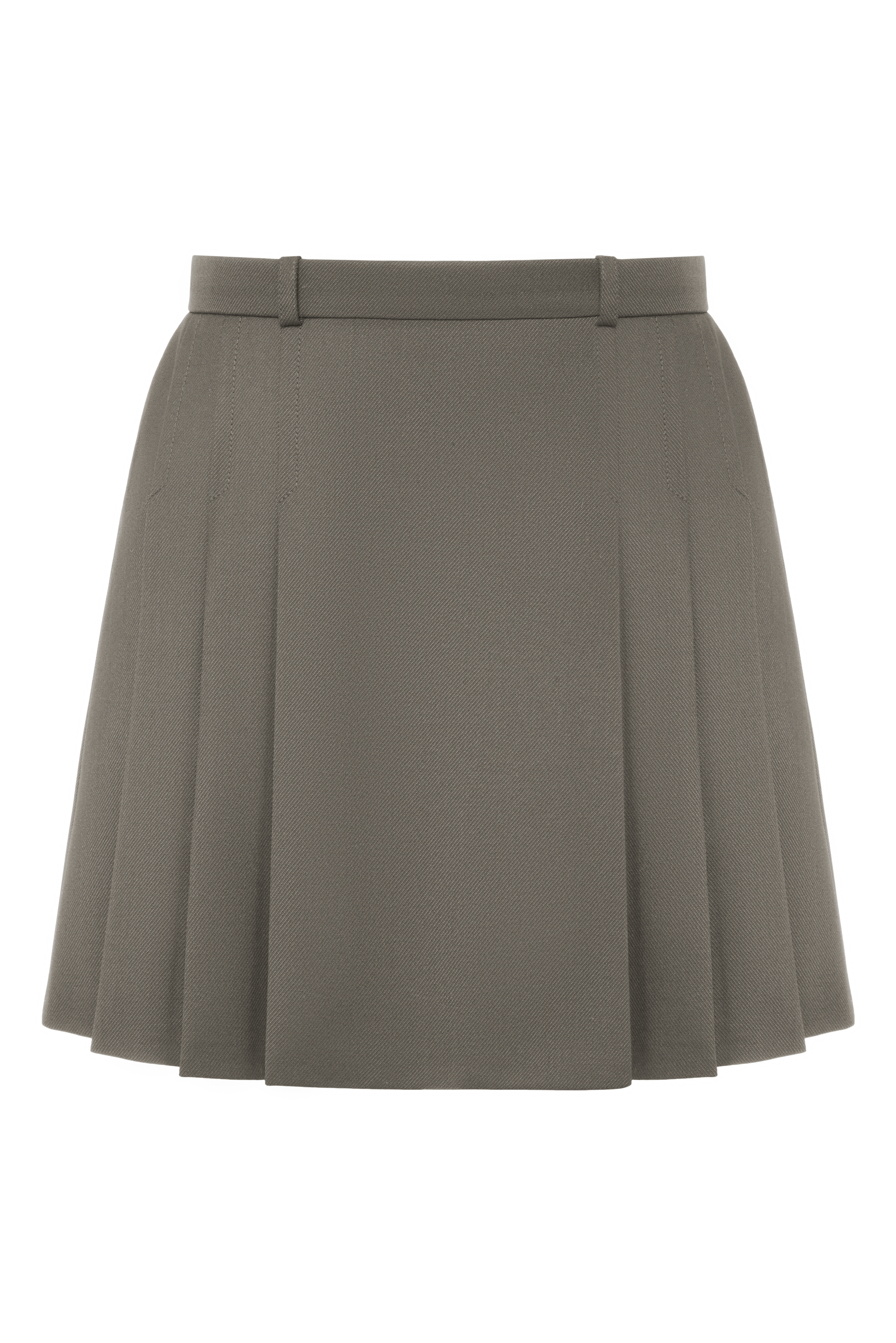 Olive Mini Skirt from O'SEVEN ELEVEN stands out with uncomplicated elegance furtherly updated with a subtle playful touch. Reminiscent of a tennis skirt silhouette with a pleat-defined construction, the piece fastens with a couple of buttons and is rendered from Italian twill fabric to elevate sporty essence with a luxe spin.