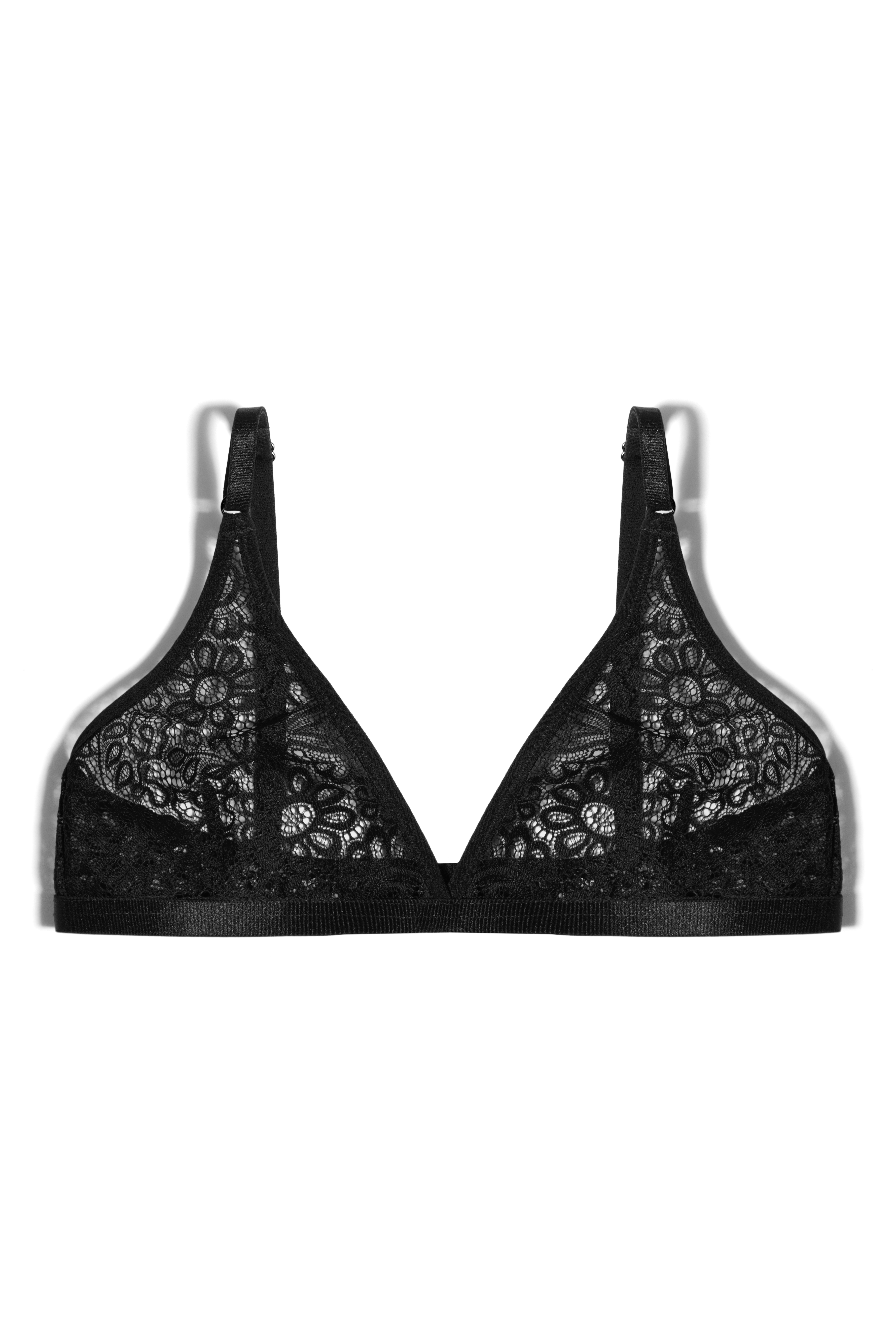 Infused with romance, Black Triangle Bralette from Sheidish is imagined with delicate floral lace. Suspended with adjustable straps, this style has a classic hook closure for a perfect fit and wire-free silhouette, which underpins day-to-night looks with comfort.