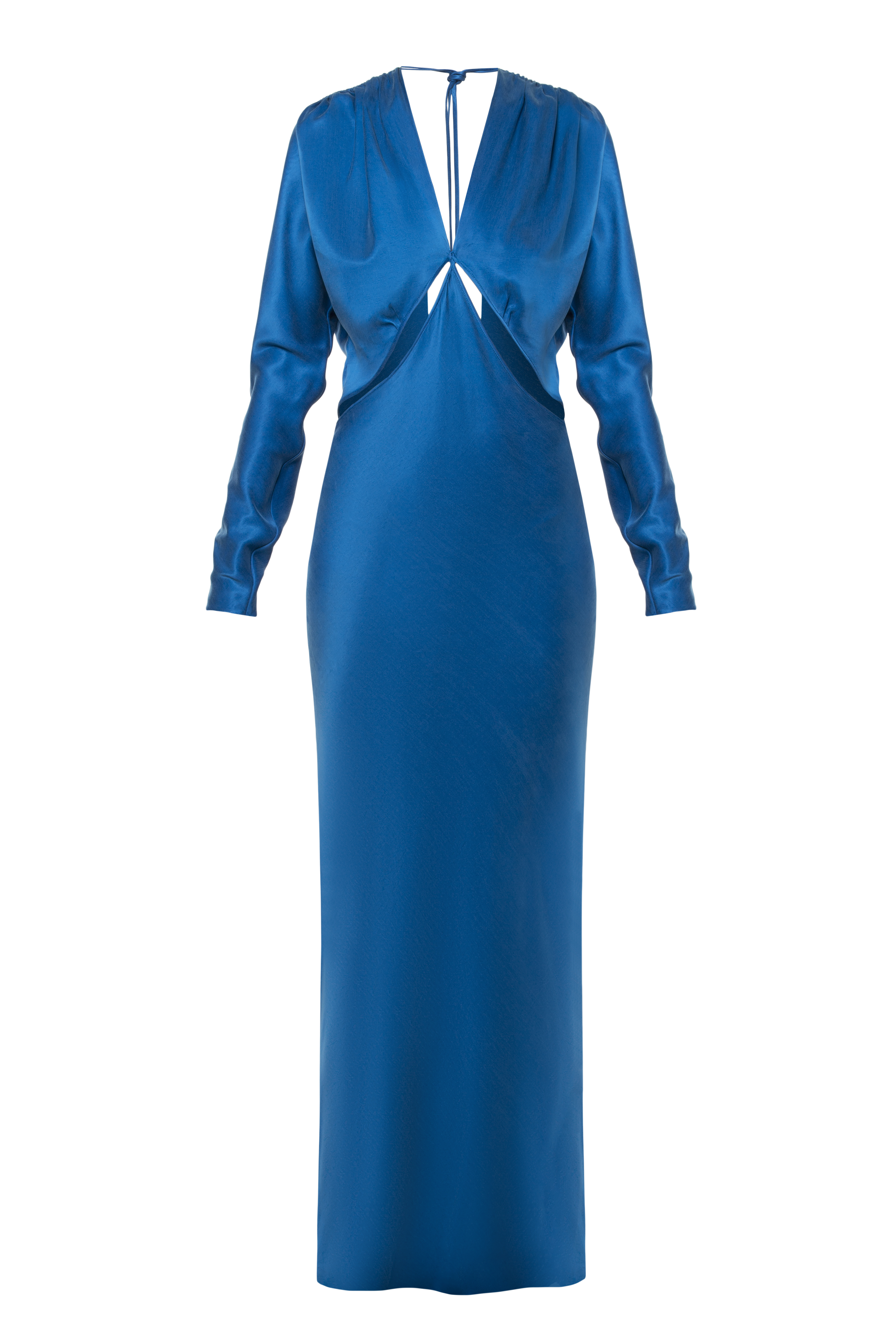 For Fall/Winter 2023, Aleksandre Akhalkatsishvili returns with a multitude of updates to his hyper-cool, effortless sensuality. One of the notable pieces is the Blue Maxi Dress - detailed with sultry cutouts and tie fastenings. The bodice of the piece is cut for a slightly loose fit to create a voluminous draped silhouette while the bottom part is more snug, featuring a showstopping long train for a dramatic touch.