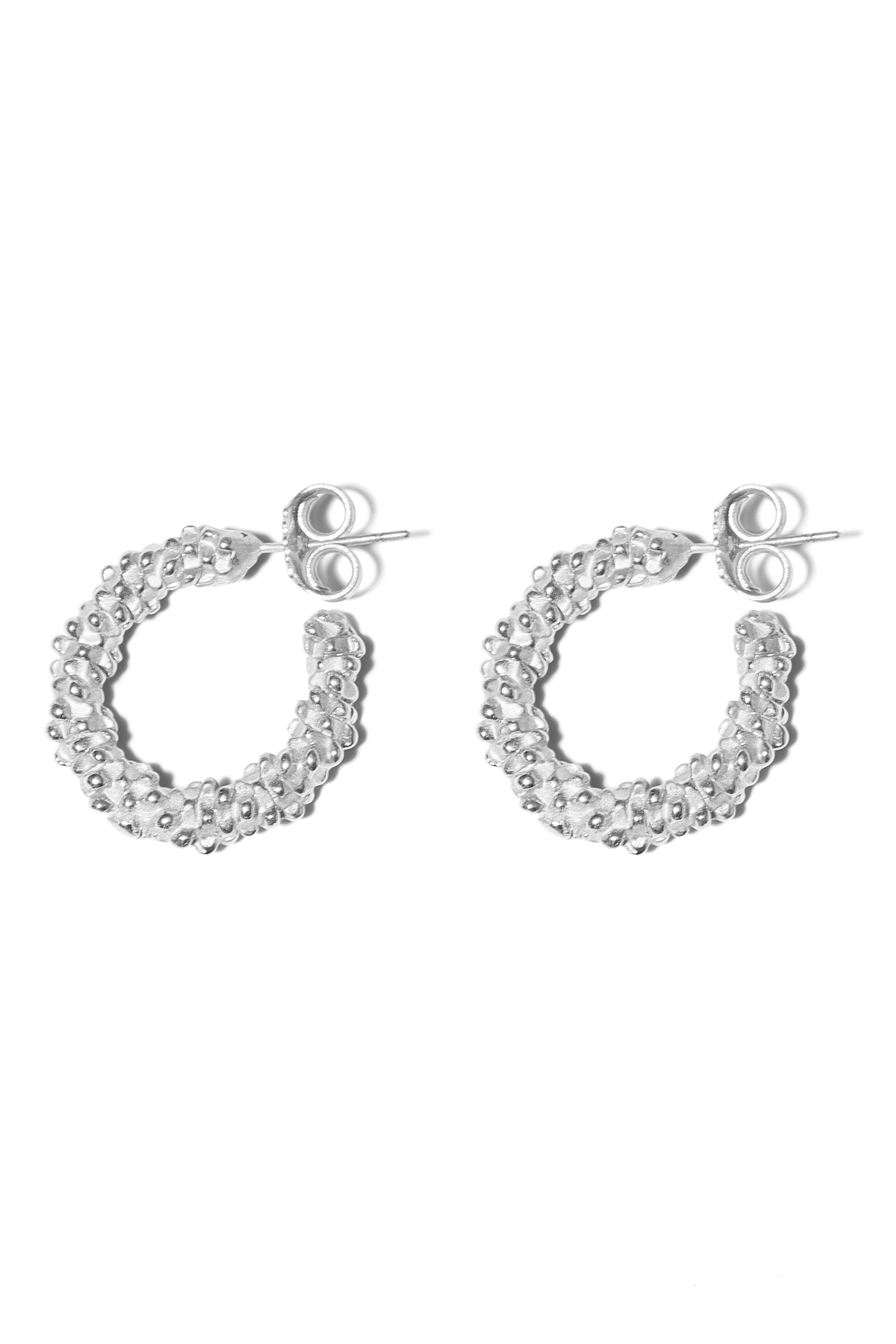 Nassimoto's design philosphy is mainly based on exploration of confronting textures in order to offer a symphony of tactile experiences. Silver Quinn Earrings from the label perfectly demonstrates above-mentioned with its delicate yet nuanced design, featuring a complex rigid profile.