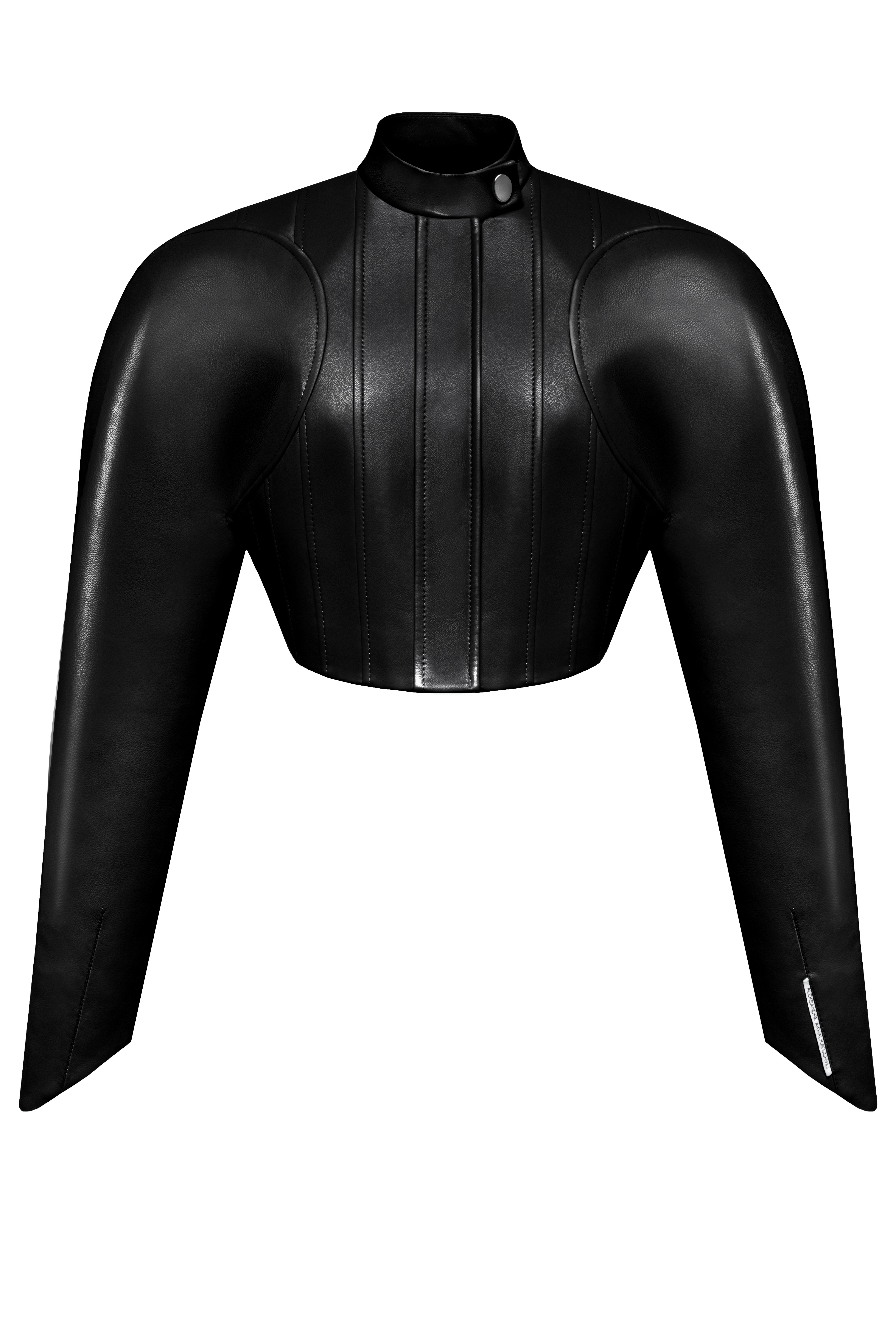 This distinctive biker-style jacket from Aleksandre Akhalkatsishvili features a narrow cropped waist and a high neck collar with button fastening for a sleek look. The padded rounded shoulders enhance its structured silhouette, while concealed button fastenings at the front maintain a clean, streamlined appearance. Fully lined for comfort, it also includes long sleeves, combining classic biker elements with a modern twist.