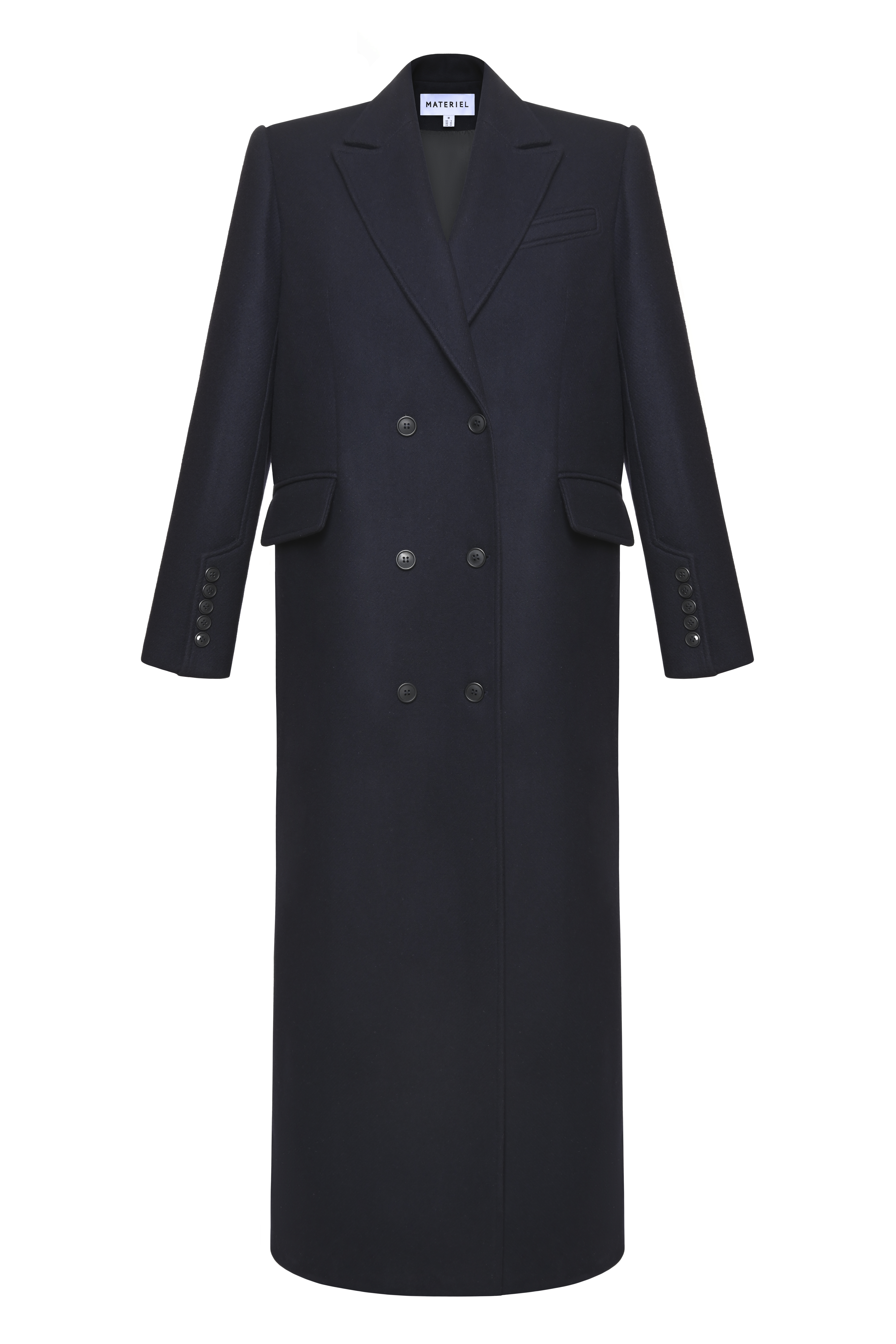 The Materiel coat showcases clean, minimalist lines that accentuate its ample proportions and classic details, blending elegance with contemporary allure in perfect balance. The piece features double-breasted fastening along with the flap pockets and notch lapels.
