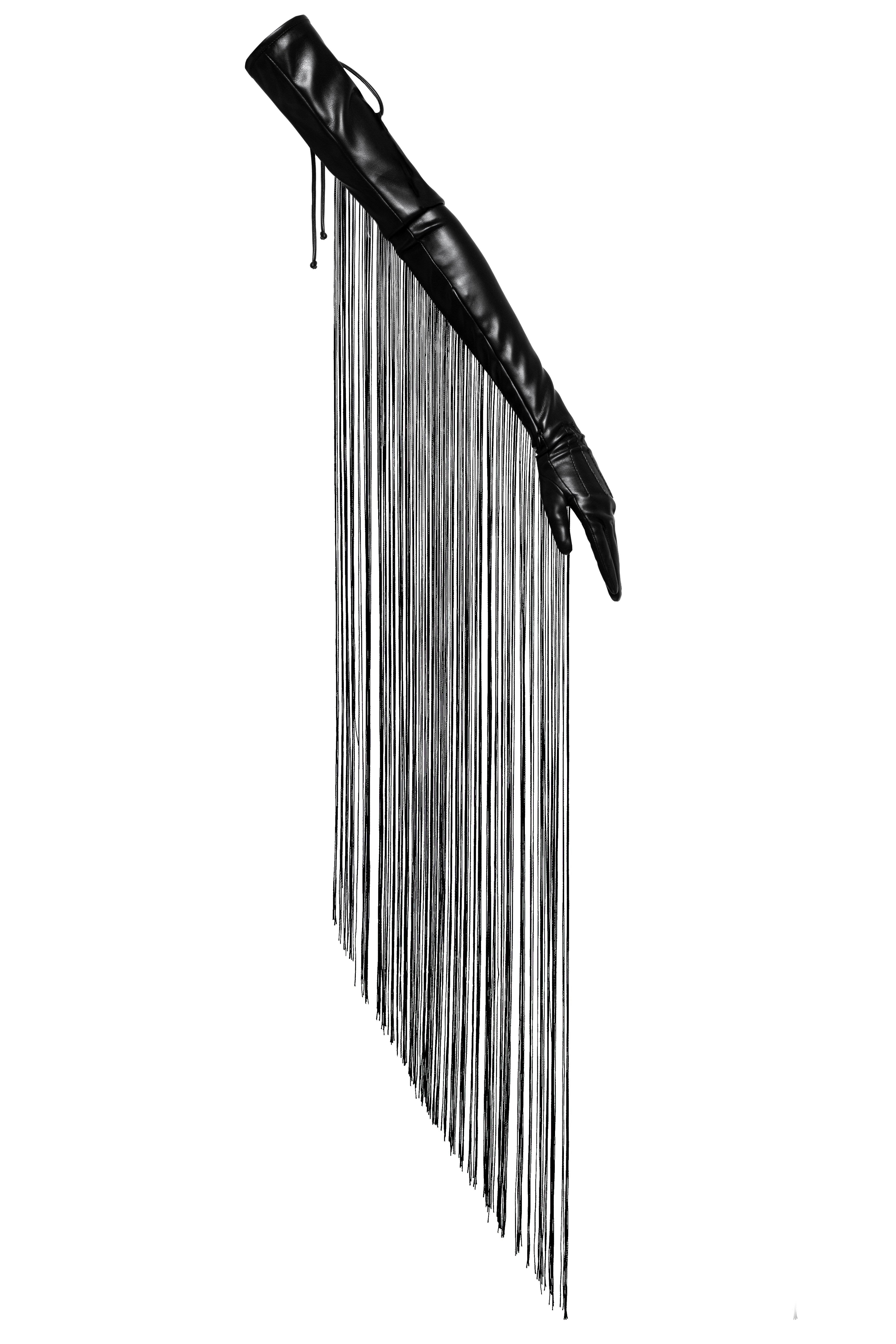 These long sleeve gloves by Aleksandre Akhalkatsishvili blend contemporary style with sophisticated details. Crafted from high-quality vegan leather, they feature a concealed side zipper and an outset tie fastening for a secure and adjustable fit. The fringes running along the length of the gloves add a playful and dynamic element, making these gloves a standout accessory for any outfit.