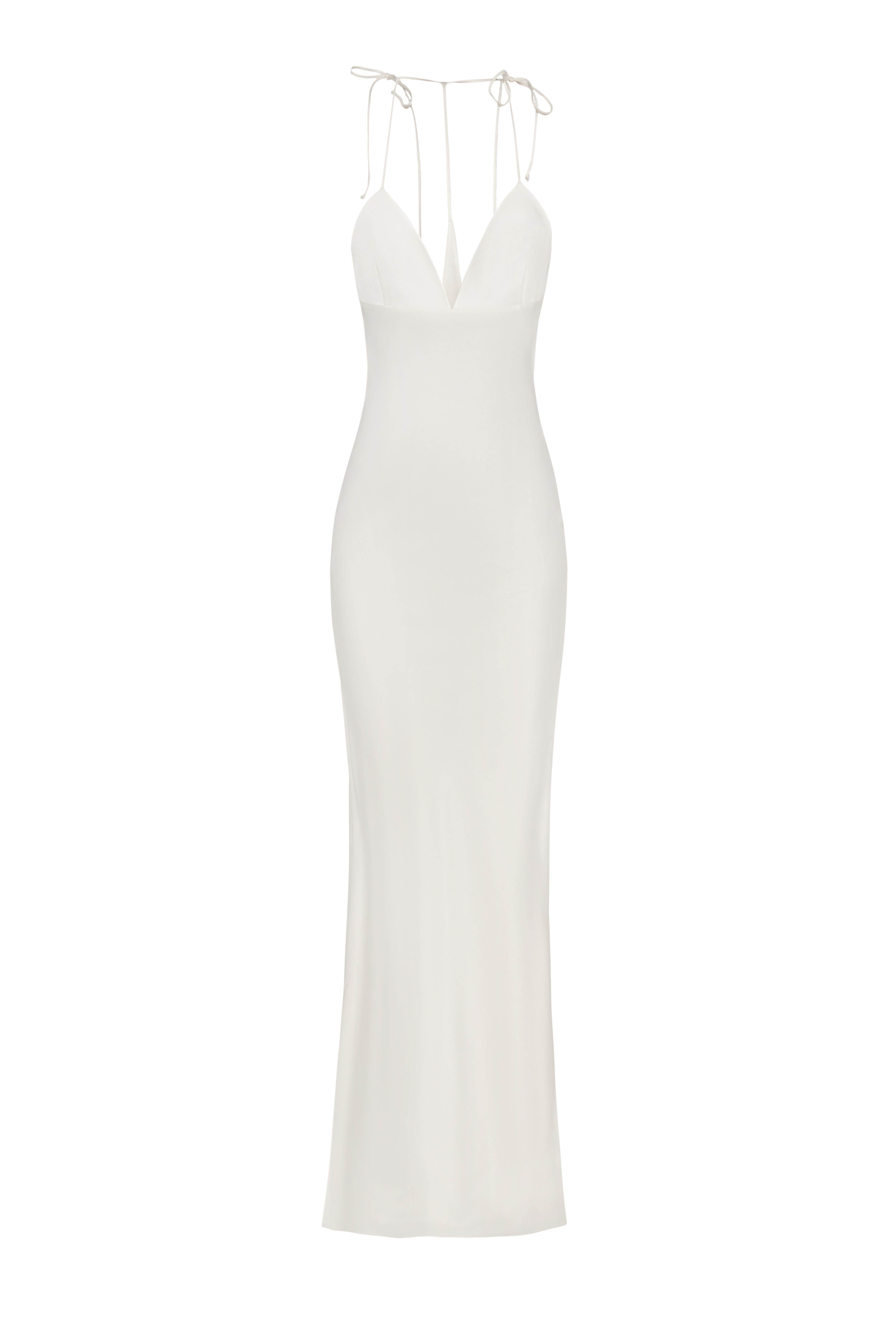 This stunning maxi dress features a flattering V-neckline and self-tie halterneck laces that allow for a customizable fit. The dress is designed with a narrow waist to accentuate the figure, while the open back and slim straps add a touch of sensual elegance. Perfect for an evening out or a special occasion.