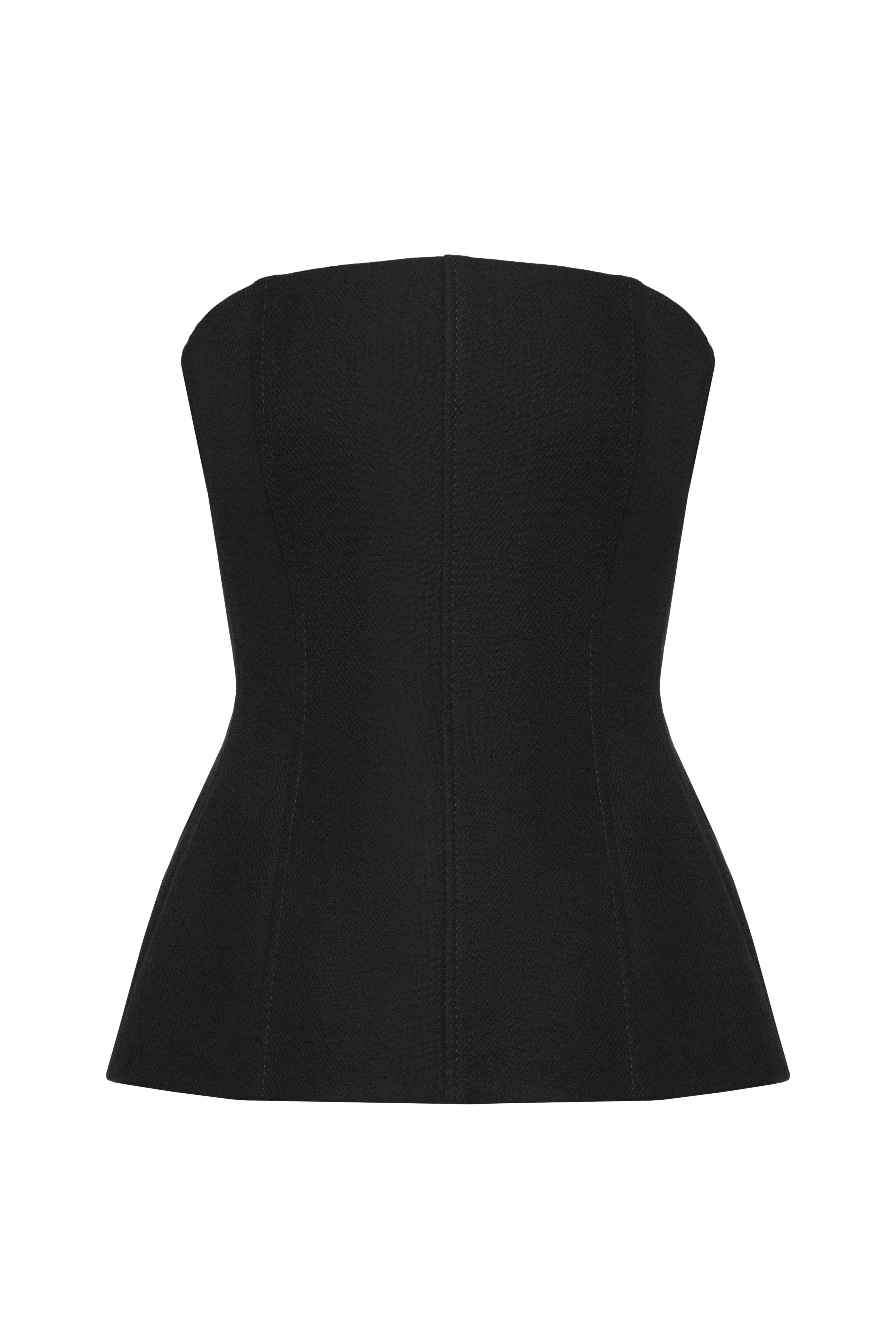 An elegant black top by Materiel, crafted from heavy cotton. Designed with a sculpted corset silhouette to accentuate the waist, it features meticulous stitching for a refined touch. Complete with a back zipper fastening and full lining for comfort and a flawless fit.