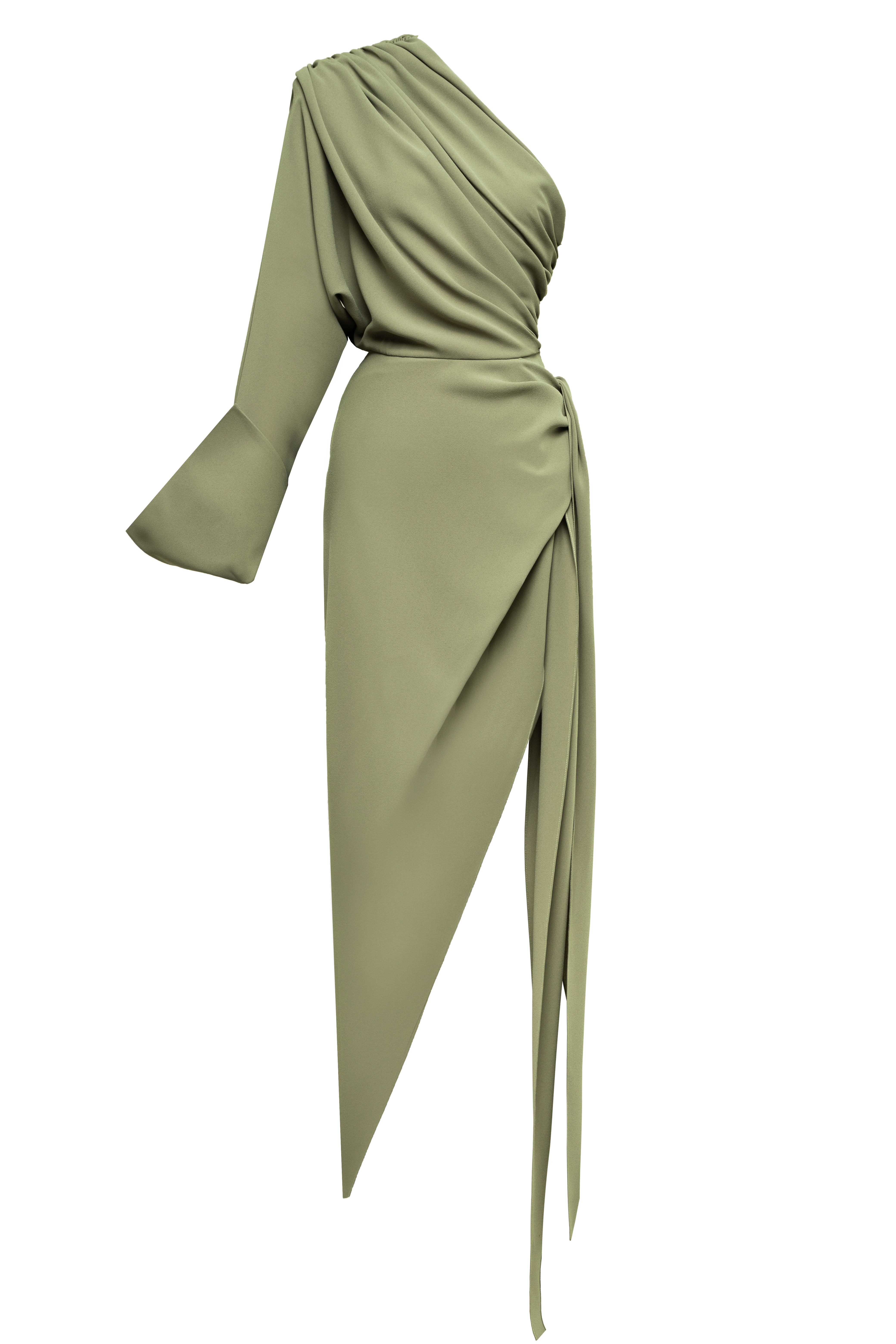 This stunning dress showcases an all-over gathered design that enhances its elegant appeal. Featuring one long sleeve with an elongated buttoned cuff, it adds a touch of sophistication. The floor-grazing self-tie fastening at the thigh creates a flattering silhouette, while the side concealed zipper ensures a seamless look. The asymmetric hem adds a modern twist, making this dress perfect for any special occasion or evening out.