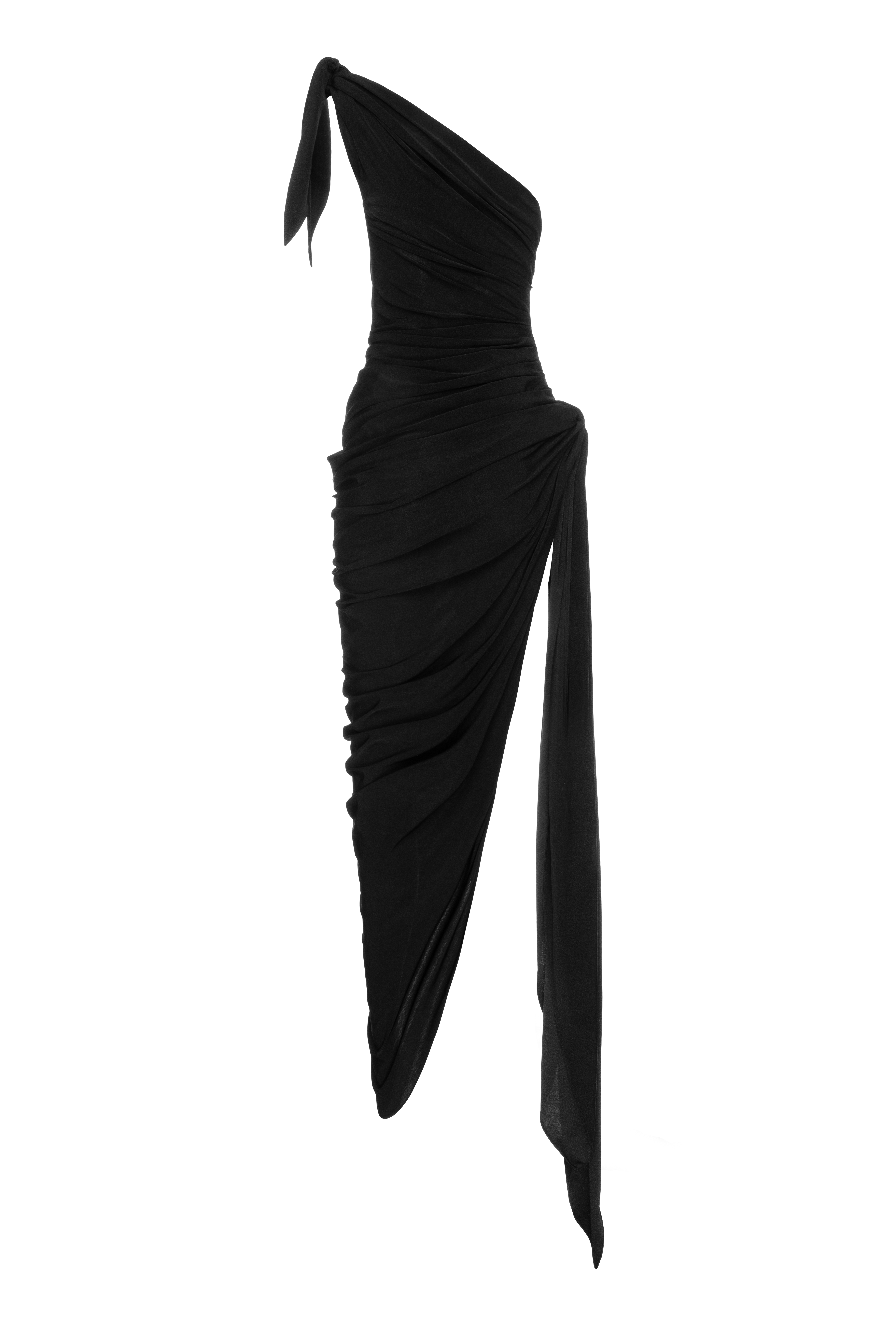 This Black Dress from Aleksandre Akhalkatsishvili showcases a single bow-tie strap, a gathered side with a concealed zipper, and a striking scarf-tie cutout along the leg, combining elegance with a modern, playful edge.