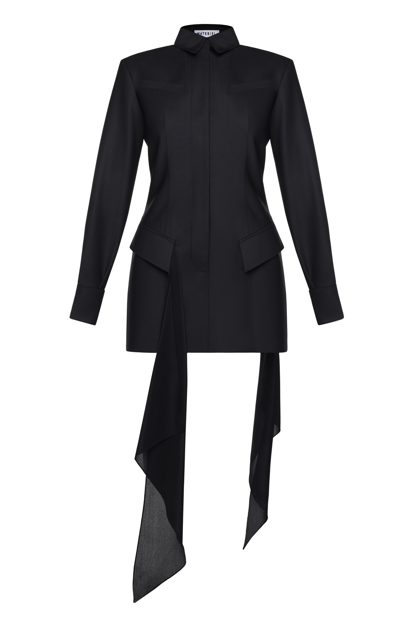 Mini black tailored dress in wool, featuring long sleeves and an airy layered design for a modern, elegant silhouette.