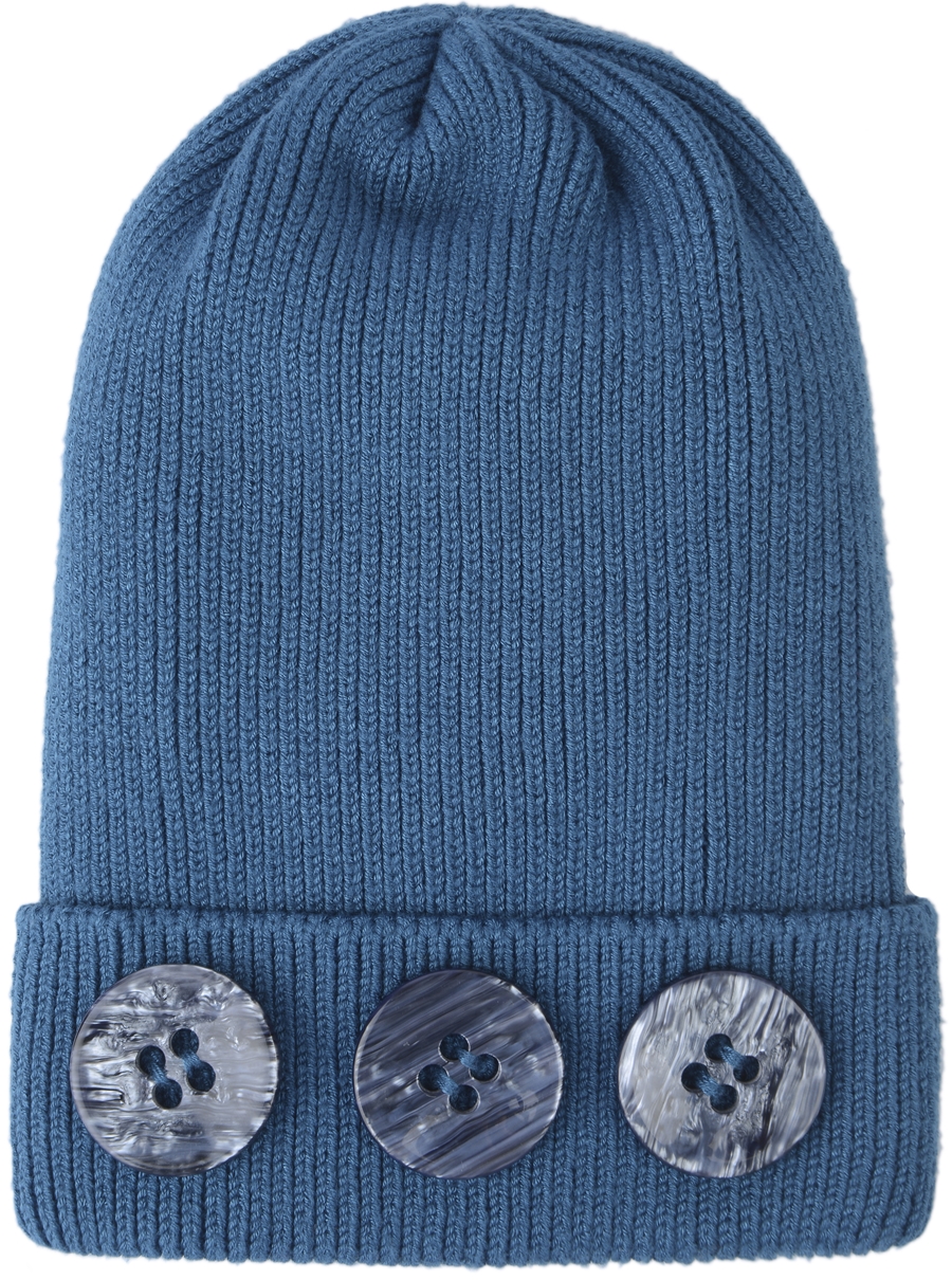 Teal beanie decorated with three oversized shimmering grey nacreous buttons.