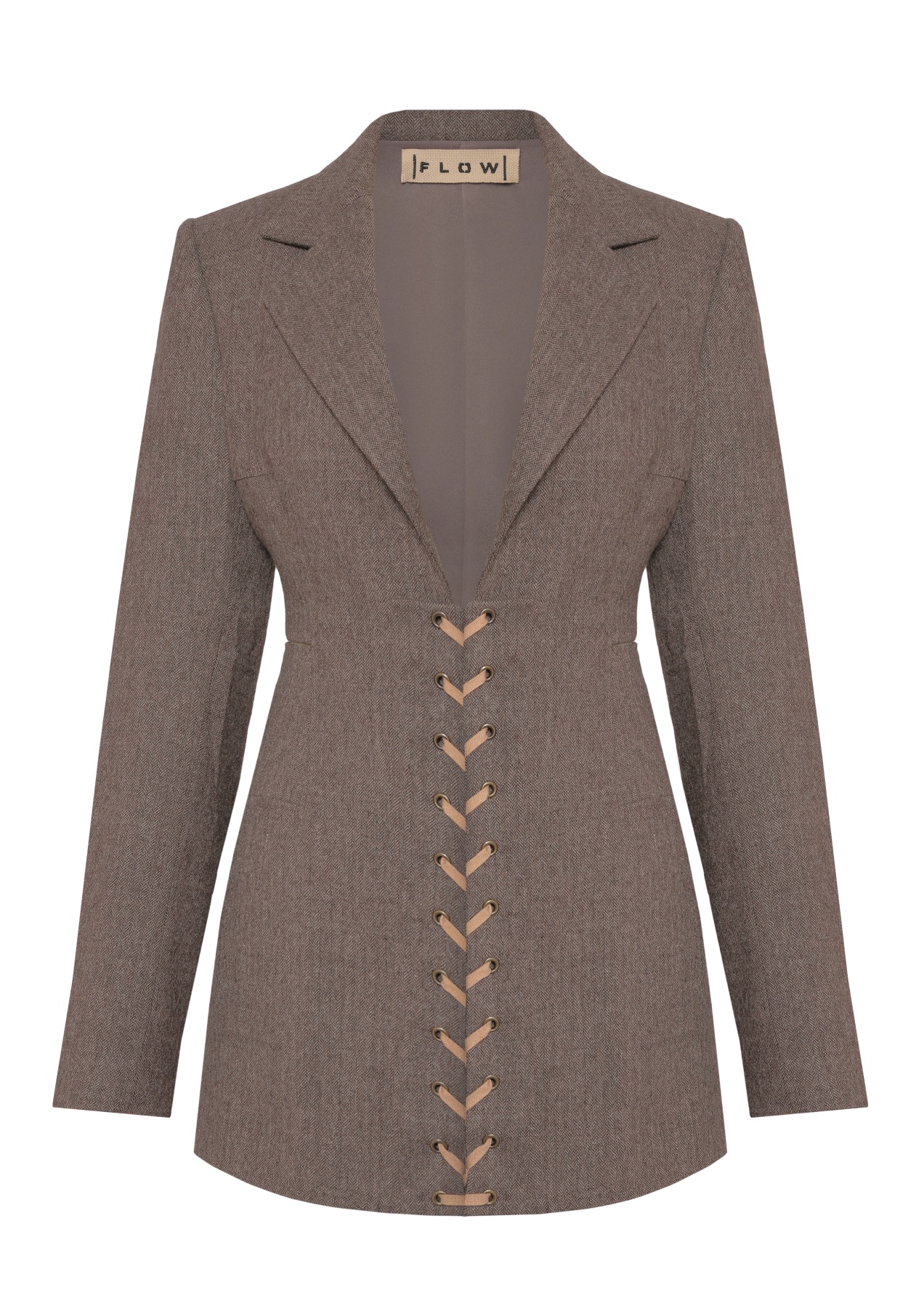 Brown wool blend fitted jacket with lapel collar, long sleeves, decorative lacing down the front, concealed front button closure and cut out details at the waist.