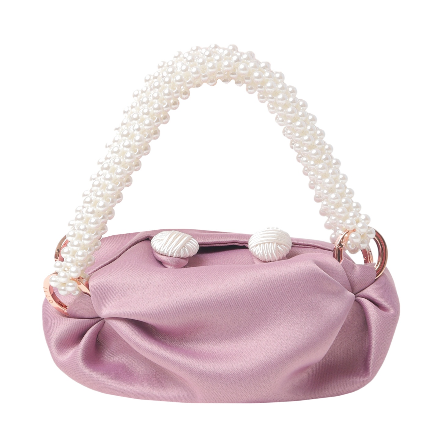 Lilac silk-satin tiny tote bag with two white buttons fastening and pearl handles.