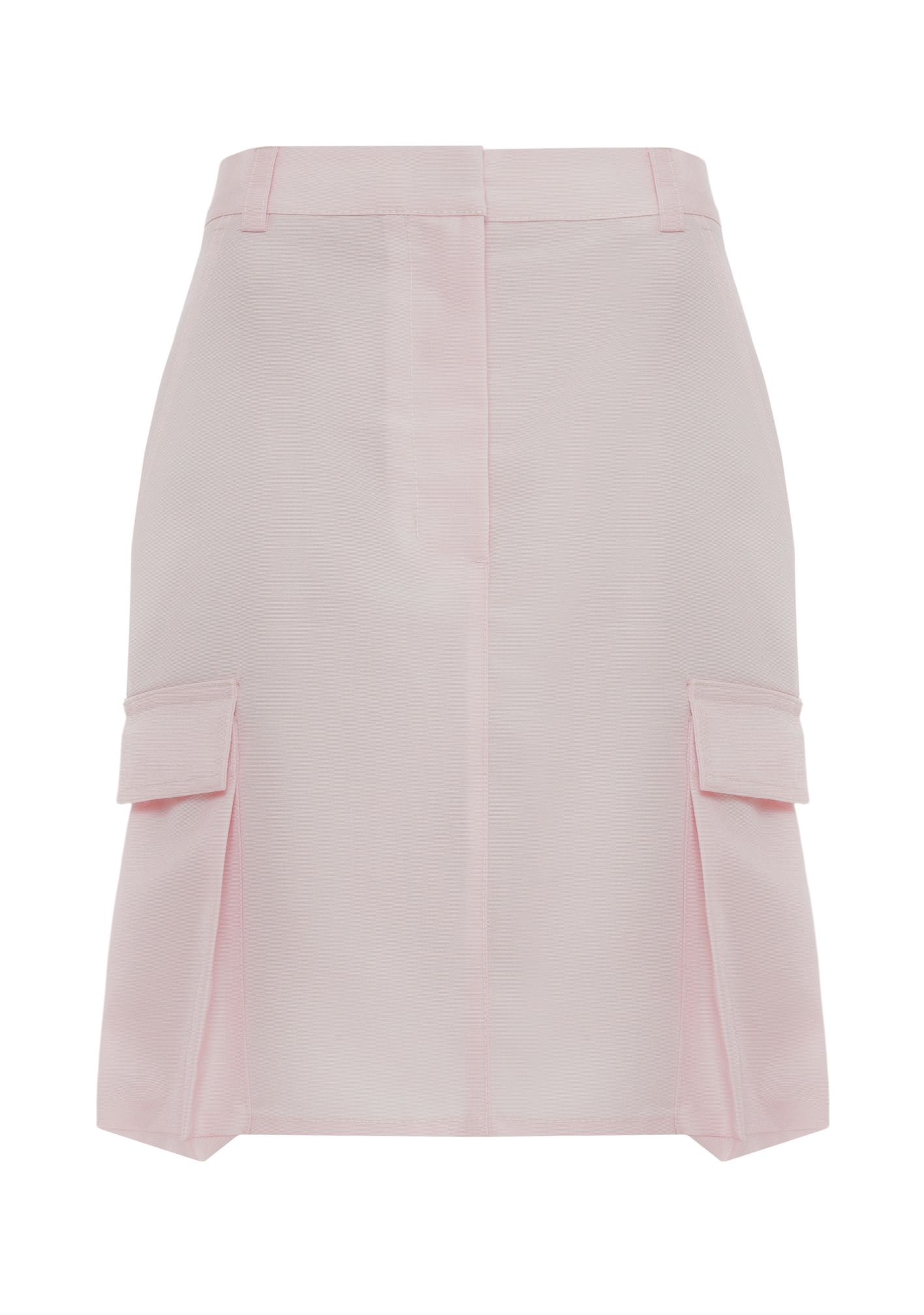 Pink fully lined, high-waisted mini skirt with side slit and deep cargo pockets, concealed zip and hook fastening at the front.